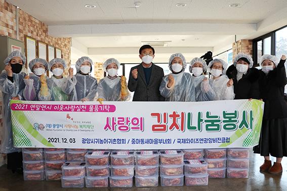 광양시귀농어귀촌협회, 중마동새마을부녀회, 국제와이즈멘 광양비전클럽, 3개 단체가 주관으로 지난3일 새마을금고 행복나눔터에서 연말연시를 맞아 이웃사랑 실천의 일환으로 관내 사회복지시설에 김장김치 120kg을 (재)광양시사랑나눔복지재단에 전달했다.