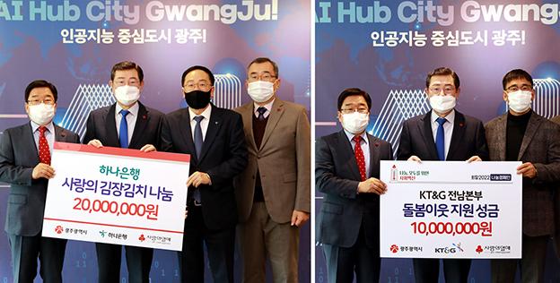 광주시는 7일 오전 시청 접견실에서 하나은행 호남영업그룹, KT&G 전남본부와 연달아 성금 기탁식을 가졌다.