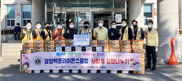 광양시 광양읍 광양백운라이온스클럽은 (재)광양시사랑나눔복지재단을 통해 지난 7일 광양읍 지역사회보장협의체에 귤 100박스와 김치 50통을 후원했다.