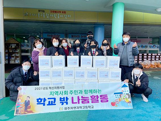 광주자연과학고가 지난 10일 특성화고에 대한 긍정적 이미지 개선을 위해지역사회 주민과 함께 하는 학교 밖 나눔 활동으로 김장김치 나눔을 실시했다.