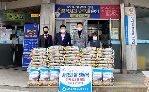 ㈜자연맛길에서 100만원 현금 지정기탁을 시작으로, 순천중부새마을금고에서 360만원 상당의 쌀10kg 120포, 연우안전산업에서 500만원 상당의 누룽지 228개를 각각 기부했다.