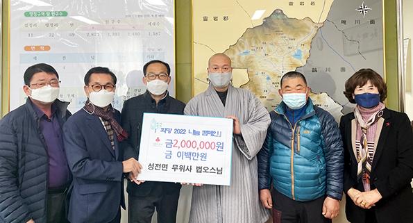 최치현 성전면장은 “매년 꾸준히 나눔을 실천해 주시는 법오스님과 관계자분들에게 감사드린다”며 “이웃을 위하고 생각하는 마음에서 시작된 나눔이 지역사회에서 선한 영향력이 되어 보다 따뜻한 사회가 되길 바란다”고 말했다.