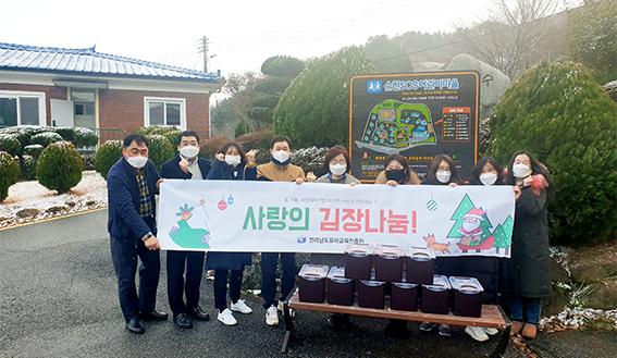 전라남도유아교육진흥원은 연말을 맞이해 지난 17일 ‘사랑의 김장나눔 행사’를 실시했다. 김진 원장을 비롯한 유아교육진흥원 직원들은 어린이들의 따뜻한 연말을 위해 정성껏 김장한 김치를 지역 아동복지시설인 순천 SOS 어린이마을에 전달했다.