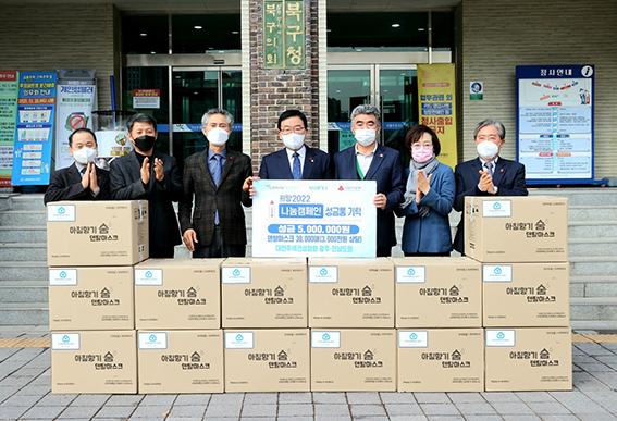정원주 대한주택건설협회 광주·전남도회장은 이날 오전 광주 북구청을 방문, 문인 청장에게 이웃돕기성금 500만원을 전달하고 코로나19 장기화로 어려움을 겪고 있는 이웃들을 위해 마스크 3만장도 기탁했다.