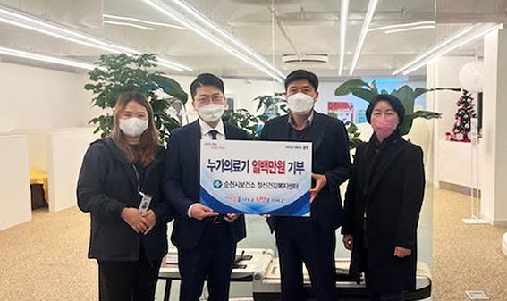 누가의료기 순천지사는 장기화된 코로나19 상황으로 불안함과 우울감을 호소하는 정서적 사회소외계층 지원에 써달라며지난 21일 100만원을 순천시 정신건강복지센터에 기부했다.