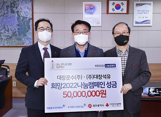 이날 대창운수㈜·㈜대창석유가 광주사회복지공동모금회에 전달한 성금 5000만원은 캠페인 기간 광주지역 곳곳의 어려운 이웃들에게 전달될 예정이다.