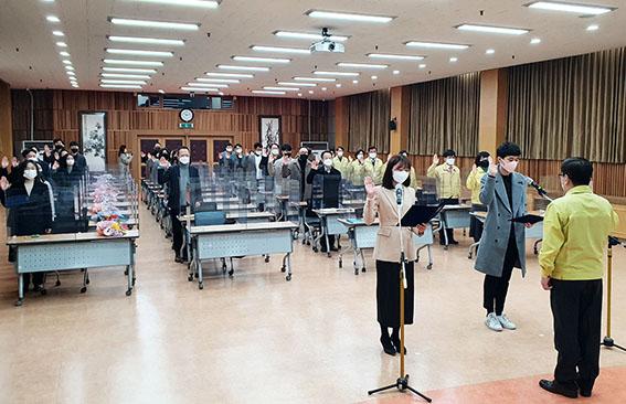 광주동부교육지원청이 3일 임인년 새해를 맞아 대회의실에서 코로나19 상황임에도 청렴은 계속돼야 한다는 의지의 일환으로 ‘2022 동부교육 시무식 및 청렴선포식’을 개최했다.