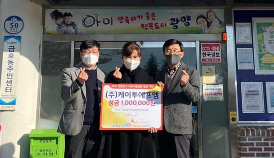 김정희 ㈜케이투에프엠 대표는 지난 6일 금호동 주민센터에서 (재)광양시사랑나눔복지재단에 100만 원을 지정 기탁했다.