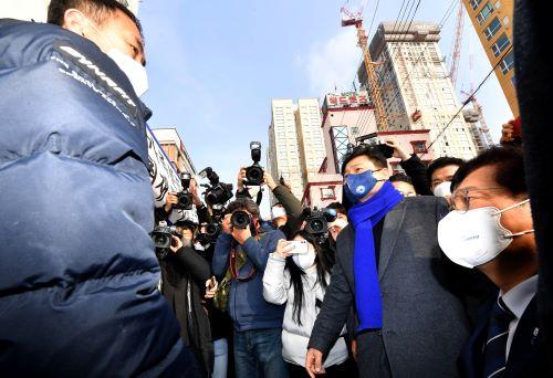더불어민주당 송영길 대표가 광주 현대산업개발 붕괴 16일 째인 26일 오전 사고 현장을 찾아 피해자 가족들의 거센 항의를 받고 있다.