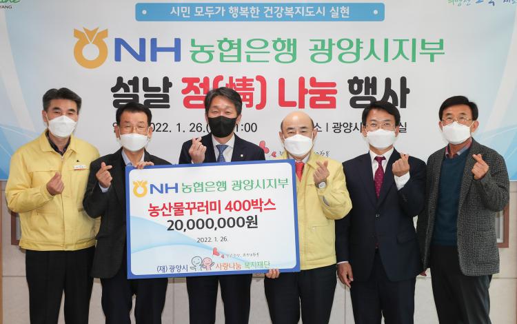 NH농협은행 광양시지부가 지난 26일 설 명절을 맞아 농산물꾸러미 400박스(2,000만 원 상당)를 (재)광양시사랑나눔복지재단에 기탁했다.