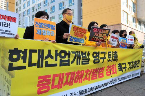 중대재해처벌법 시행 첫 날인 27일 정의당 광주시당이 광주 서구 화정동 현대산업개발(이하 현산) 신축 아파트 붕괴사고 현장에서 기자회견을 열고 "국회는 중대재해처벌법 개정법률안 심사를 서두르고, 이미 발의돼 있는 건설안전특별법을 2월 임시회에서 처리할 것"을 촉구했다.