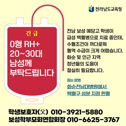 전남도보성교육지원청에서는 급성 백혈병 진단을 받고 화순전남대병원에서 항암치료 중인 고등학생을 위한 도움의 손길을 모으고 있다.