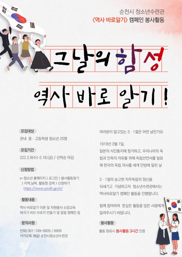 순천시는 청소년들의 올바른 역사의식 함양을 위해 청소년수련관에서 우리역사 바로알기 캠페인 ‘그날의 함성’을 운영한다고 10일 밝혔다.