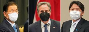 정의용 외교장관과 토니 블링컨 미국 국무장관, 하야시 요시마사 일본 외무상은 12일(현지시간) 하와이 호놀룰루 아시아·태평양안보센터(APCSS)에서 진행한 외교장관 회의 이후 공동 성명을 통해 "최근 북한의 탄도미사일 발사를 규탄한다"라고 밝혔다.