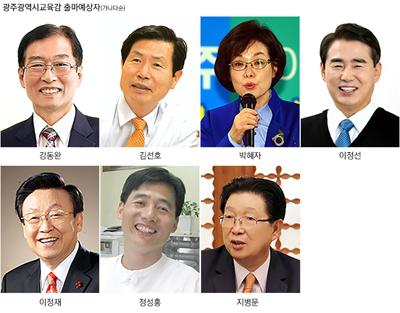 15일 지역 교육계에 따르면 이날 현재 '광주교육감 선거에 도전하겠다'며 출마를 공식화 한 입지자(가나다 순)는 강동완(67) 전 조선대 총장, 김선호(74) 전 광주효광중 교장, 박혜자(66) 전 한국교육학술정보원장, 이정선(63) 전 6대 광주교대 총장, 이정재(75) 전 2대 광주교대 총장, 정성홍(60) 전 전교조 광주지부장 등 모두 6명이다.