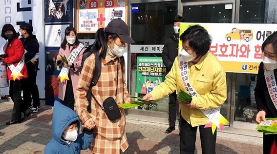 이번 캠페인은 학생들이 하원 후 학원 차량으로 탑승하는 시간대에 학원 중심가에서 집중적으로 실시하였으며, ‘우리아이 통학버스 동승보호자와 함께해요’라는 문구가 담긴 KF94마스크를 전달하고, 도로교통법상 어린이통학버스 관련 준수사항 및 처벌기준이 담긴 전단지를 배부하는 활동 등을 펼쳤다.