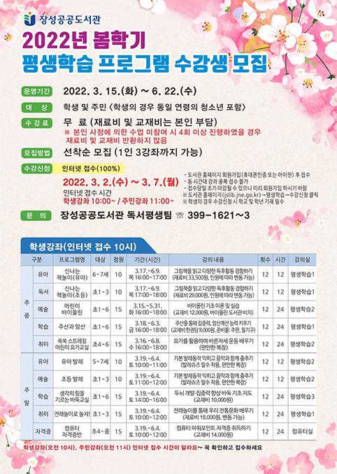 장성공공도서관은 학생 및 지역주민에게 다양한 평생학습 기회를 제공하고자 ‘2022년 봄학기 평생학습 프로그램’ 수강생을 도서관 홈페이지를 통해 선착순 모집한다.