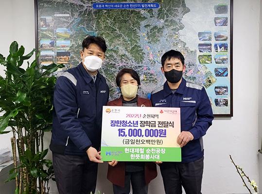 현대제철 순천공장 한뜻회봉사대는 대학 신입생 청소년들에게 전달해 달라며 1500만 원의 장학금을 지난 24일 순천시에 기탁했다.