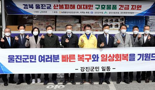 강진군도 이날 묵은지와 햇반 등 2100만원 상당의 구호품을 경북 울진 산불 피해지역에 지원했다.
