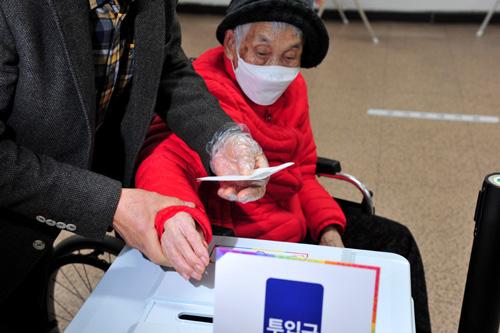 박씨는 지난 2020년 총선 당시 며느리의 부축을 받으며 두발로 걸어 투표소로 들어섰다. 그러나 이번에는 연로한 나이 탓에 부득이하게 휠체어에 올라타게 됐다.