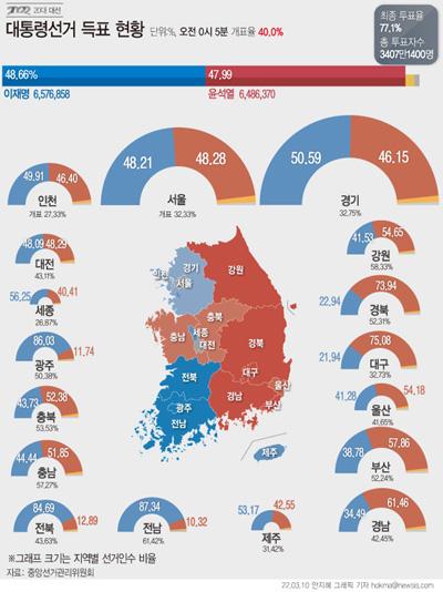 중앙선거관리위원회에 따르면 10일 0시6분 현재 개표율이 40.00%를 기록한 가운데 이 후보는 48.65%(657만5501표), 윤 후보는 47.99%(648만5638표)를 득표 중이다.