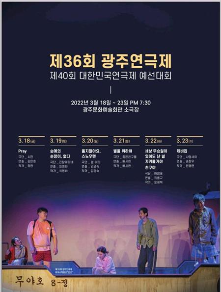 한국연극협회광주지회(광주연극협회)는 제36회 광주연극제가 ‘연극사랑-관객사랑’을 주제로 18일부터 23일까지 광주문화예술회관 소극장에서 펼쳐진다고 13일 밝혔다.