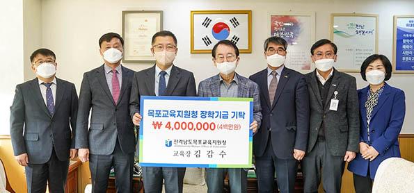 목포교육지원청이 16일 목포장학재단에 우수인재 양성을 위한 장학기금으로 사용해달라며 ‘2021년 하반기 지방재정집행실적’ 우수 포상금 400만원을 전액 기탁했다.