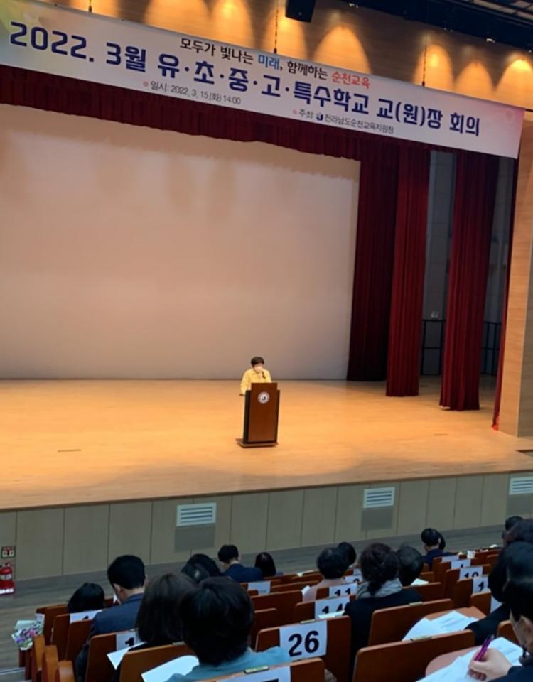 순천교육지원청은 관내 유·초·중·고·특수학교 교(원)장 84명이 참석한 가운데,지난 15일 순천만생태문화교육원 공연장에서 2022학년도 3월 교(원)장 회의를 개최했다.
