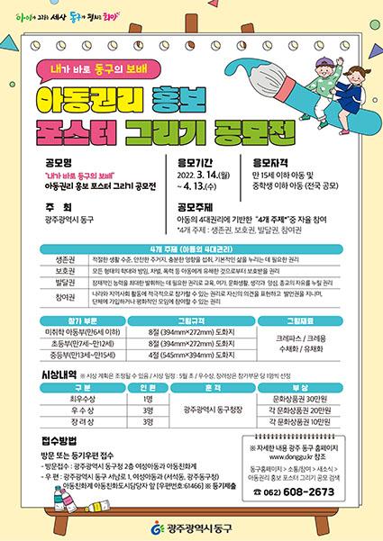 광주 동구는 아동 권리에 대한 올바른 인식 확산을 위해 “내가 바로 동구의 보배” 아동 권리 홍보 포스터 공모전을 개최한다고 밝혔다.