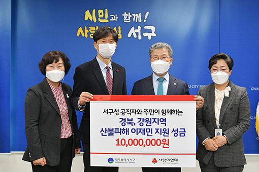 광주 서구가 지난 17일 경북 울진과 강원도 삼척 등 동해안 산불 피해지역 이재민들을 돕기 위해 사회복지공동모금회에 성금 1000만 원을 전달했다고 밝혔다.