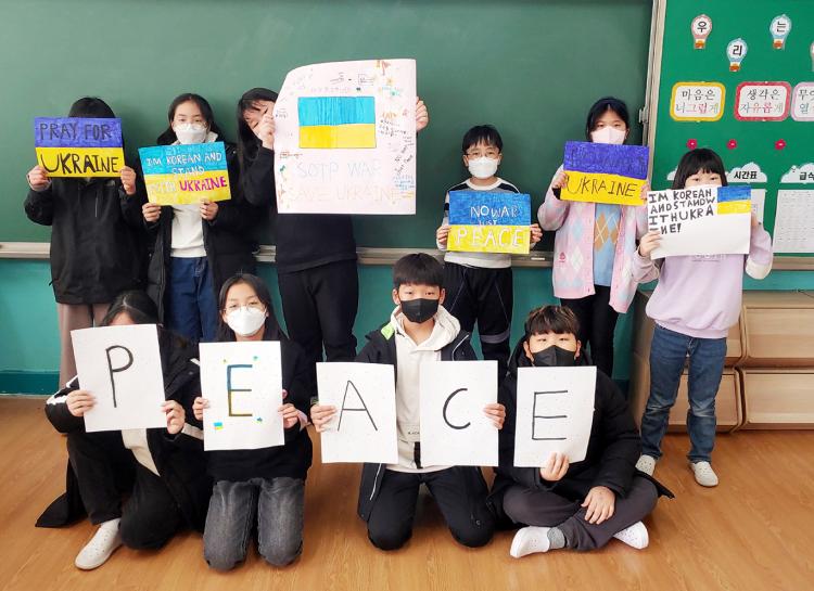 이날 활동은 학교특색교육인 ‘김대중 평화·인권의 길 프로젝트’로 지구 반대편에서 일어나고 있는 전쟁이지만 세계시민으로서 평화가 짓밟히고 인권이 무시되고 있는 전쟁의 참상을 알고 평화와 인권을 지켜내기 위해서 힘겨운 싸움을 하고 있는 우크라이나 시민들에게 응원과 평화를 함께 지키고자 하는 마음에서 실시됐다.