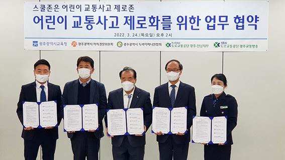 광주시 자치경찰위원회가 24일 TBN 광주교통방송국에서 광주시교육청, TBN광주교통방송, 도로교통공단 광주·전남지부, 광주 녹색어머니연합회와 \'어린이 교통사고 없는 스쿨존 만들기\'를 위한 업무협약을 체결했다.