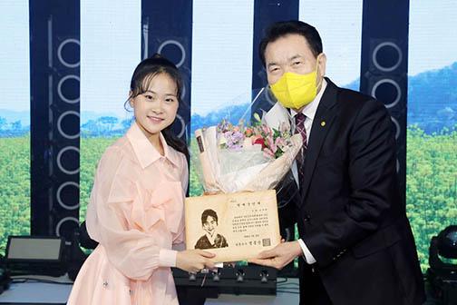 장흥군은 지난 25일 장흥군실내체육관에서 열린 정남진 ‘흥’ 콘서트 행사에서 김다현에서 장흥군 명예군민증을 전달했다.
