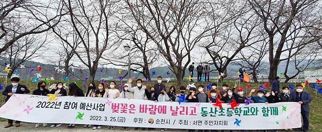 순천시 서면 주민자치회는 지난 24일부터 25일까지 동산초등학교, 전자고등학교 학생들과 함께 서천변 벚꽃길에 바람개비 공원을 조성했다.