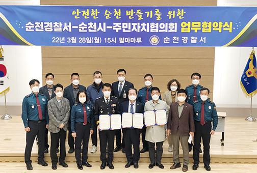 순천경찰서는 순천시, 주민자치협의회와 ‘안전하고 살기 좋은 순천 만들기’를 위한 범죄예방 환경 정책 및 마을계획 사업 추진에 대해 상호 협력하기로 약속하고 지난 28일 업무협약을 체결했다.