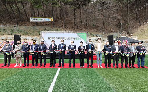 광주 동구는 지난달 30일 지역민들의 생활체육 저변확대를 위해 ‘동구 다목적체육관 부설축구장’을 건립하고 준공식을 가졌다고 밝혔다.