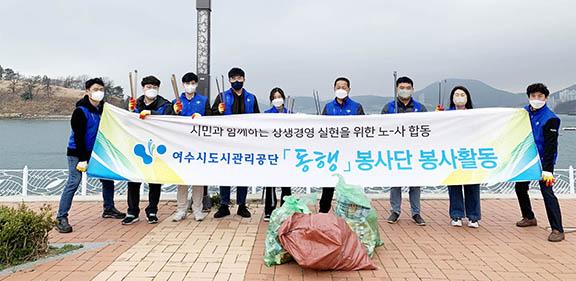 여수시도시관리공단 직원으로 이뤄진 \'동행\' 봉사단 60여 명은 지난 3월 23일부터 28일까지 친환경 사회공헌 활동의 하나로 웅천 해변공원 일대 등 여수시 6곳에서 환경정화 봉사활동을 실시했다고 밝혔다.