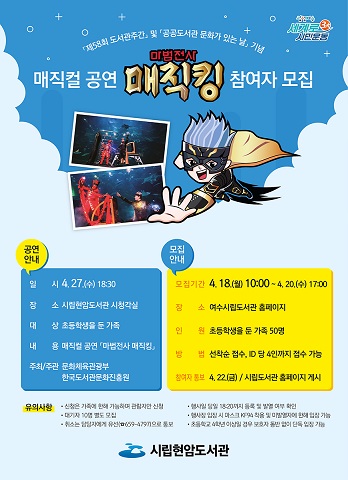여수시립현암도서관은 제58회 도서관 주간을 맞아 판타지 마술쇼 ‘마법전사 매직킹’ 공연을 개최한다.