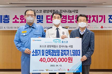 최현경 광양소방서장은 “기업시민으로서 광양시민의 안전에 관심을 가지고 소화기, 화재 감지기 등 주택형 소방시설을 지원해주신 광양제철소에 감사하다. 화재로부터 지역민들의 안전과 재산을 지키는데 최선을 다하겠다”고 말했다.