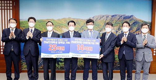 19일 전남도에 따르면 전남개발공사는 이날 전남인재평생교육진흥원과 전라남도문화재단에 각각 25억 원과 14억 원 등 모두 39억 원의 기부금을 기탁했다.
