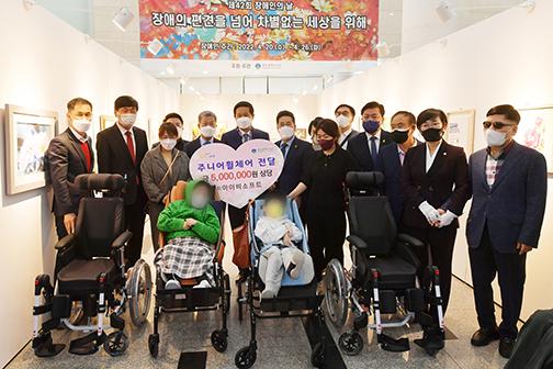 광주 서구가 20일 제42회 \'장애인의 날\'을 맞아 중증 주니어 장애인을 위한 휠체어를 후원받아 전달하고 장애인 예술가들을 초청해 그림 작품 전시회와 직원 대상 장애인 인식개선 교육을 실시했다.