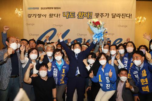 강기정 광주시장 예비후보가 26일 이용섭 현 광주시장을 꺾고 경선에 승리, 지지자들과 환호하고 있다.