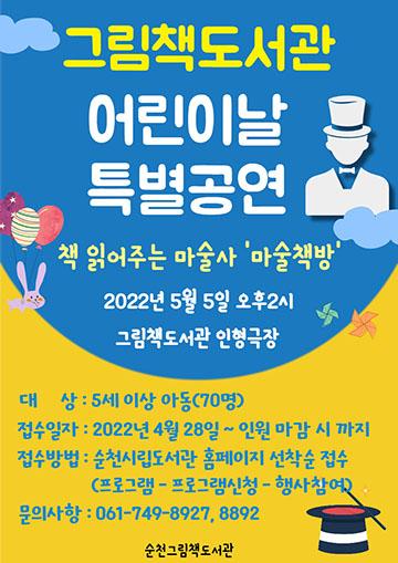 5월 5일 오후 2시 그림책도서관 인형극장에서 진행되는 ‘책 읽는 마술사·마술책방’은 아이들이 좋아하는 마술로 책에 대한 관심도를 높이고 올바른 독서방법 및 습관을 독려할 수 있는 내용으로, 기존의 동화내용을 각색해 이뤄진 공연이다.