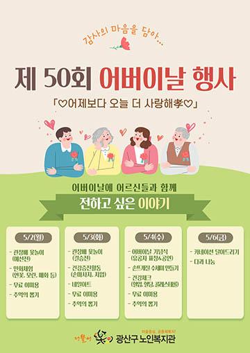 제50회 어버이날을 맞이하여 광산구 노인복지관(더불어락, 행복나루 노인복지관)이 5월 첫째 주 경로효친 주간 기념행사를 개최한다.