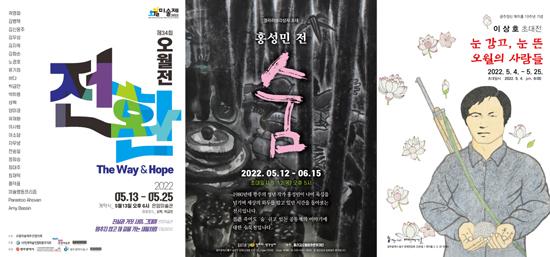 민족미술인협회광주지회(광주민미협)는 제34회 오월전 ‘전환-The Way & Hope’를 은암미술관과 무등갤러리(13일~25일)에서 선보이며 갤러리 ‘생각 상자’에서는 홍성민 작가 초대전 ‘숨’(12일~6월15일)이 펼쳐진다.