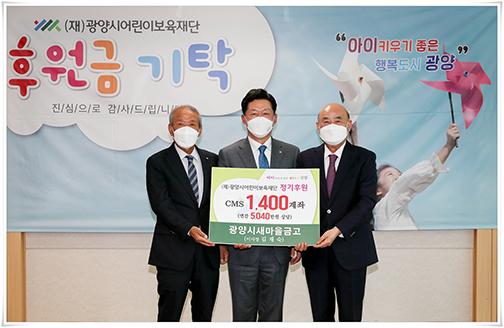 (재)광양시어린이보육재단은 지난 9일 정현복 광양시장, 강용재 재단 상임이사, 기탁자 등 10여 명이 참석한 가운데 후원금 기탁식을 가졌다.