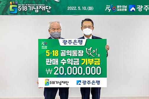 광주은행은 10일 5·18 공익통장 \'넋이 예적금\' 판매수익금의 일부를 2년 연속 5·18기념재단에 기부했다고 밝혔다.