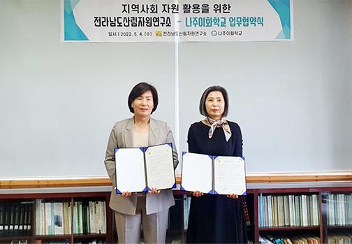 전남도산림자원연구소가 나주 이화학교와 숲교육 프로그램 활성화 및 상호 협력 강화 업무협약을 해 숲 치유를 통한 지역사회의 동행을 실천하고 있다.