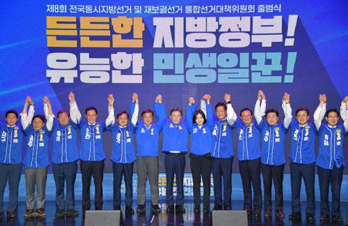 민주당은 11일 국회 의원회관에서 이재명 고문을 총괄선대위원장으로 하는 당 중앙선대위 출범식을 열었다. 박지현·윤호중 공동 비상대책위원장이 당연직 상임선대위원장을 맡았고, 박홍근 원내대표와 17개 시도지사 후보들이 공동선대위원장단에 이름을 올렸다.