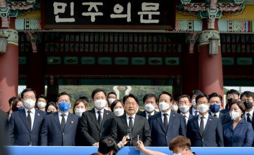 강기정 광주시장 후보를 비롯한 민주당 소속 기초단체장, 광역·기초의원 후보 등 90여 명과 송갑석 민주당 광주시당 위원장은 이날 오전 광주 북구 운정동 국립5·18민주묘지를 참배했다.
